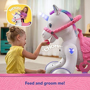 The 12 Volt Ride-On Toy for Toddlers and Kids - Rideamal Unicorn with a Maximum Rider Weight of 70lbs is the ultimate adventure companion for young children. This interactive ride-on toy brings imagination to life with over 100 unique sounds and movements, ensuring that every playtime is a new and exciting experience. Designed for children ages 3 to 7, this magical unicorn can carry a maximum weight of 70 lbs, making it suitable for a wide range of ages and sizes.Boys and girls alike will have endless fun with Josie the Rideamal Unicorn. They can feed, brush, pet, walk, ride, or even dance with Josie, creating a bond like no other. Josie comes to life with her light-up horn and fully motorized eyes, ears, head, and wheels, making her a truly magical companion.Feeding and grooming Josie is a delightful experience for kids. They can hear munching noises as they feed Josie a tasty treat, and her ears move when they brush her mane. The ride-on unicorn comes with a brush, cupcake, flowers, and saddlebag, adding to the imaginative play.Josie responds to affectionate gestures with different movements and sounds. When kids pet her nose and cheeks, she will show her appreciation in the most adorable way. This interactive feature enhances the bond between children and their magical unicorn friend.Riding Josie is an exhilarating experience. With three different speeds, kids can choose to trot at 3.5 MPH, gallop at 4 MPH, or even go backward at 3.5 MPH. They can sit in the saddle, hold the reins, and pick their desired speed for an exciting ride-on adventure.This ride-on toy is made with high-quality materials and is designed to ensure the safety and enjoyment of children. It is suitable for both indoor and outdoor use, allowing kids to embark on thrilling adventures wherever they go. The white color adds a touch of elegance to the unicorn's design, making it even more appealing to young riders.Additional Specifications:- Binding: Sports- Studio: Pacific Cycle, Inc.- Release Date: 2020-07-01- Publisher: Pacific Cycle, Inc.- Product Type: Toys and Games- Product Group: Sports- Package Quantity: 1- Number of Items: 5- Model: KT1489I- Material Type: Plastic- Manufacturer Minimum Age: 36.0 months- Manufacturer Maximum Age: 84.0 months- Manufacturer: Pacific Cycle, Inc.- Label: Pacific Cycle, Inc.- Color: White- Brand: Does Not Apply- Type: Does Not Apply- EAN: Does Not Apply