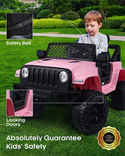 The 12V 7Ah Electric Kids Ride On Car Power Wheels Jeep - 2 Seater is the perfect ride-on toy for adventurous kids who are eager to experience the thrill of driving. This lifelike rc ride on truck provides a realistic and child-appropriate driving experience, allowing young drivers to understand the automotive mechanism and develop their driving skills.With its one-button start design, horn and engine sounds, and real foot pedal acceleration, this ride-on car gives kids the feeling of being behind the wheel of a real car. The steering direction control allows them to navigate their way through exciting adventures, while the bright LED lights and rearview mirror add to the authenticity of the driving experience.This ride-on car offers two driving modes to suit different age groups. Older children can operate the toy car independently using the steering wheel and pedals, giving them a sense of control and independence. For younger babies, parents can use the included 2.4G remote control to safely guide the car and avoid any potential dangers. The remote control allows parents to control the forward, backward, left, and right steering, with an emergency brake button for added safety.To enhance the driving pleasure, the MOTION kids' car features a built-in music player and various music options. With USB/AUX ports and Bluetooth connectivity, parents can play the child's favorite music, songs, or nursery rhymes while they drive, adding to the excitement and enjoyment of the ride.The control panel of this toy car is designed to be multi-functional and engaging. It includes an oversized color LED display that shows the battery level, music volume, and speed mode. The panel also features speed adjustment, a simulated car-style horn, music playback, volume adjustment, forward and reverse control keys, and a one-touch start button, providing endless driving fun for kids.This ride-on truck is equipped with upgraded configurations for a more powerful and comfortable driving experience. It features a 30W*2 strong motor that provides dual driving force and sufficient power. The whole vehicle is equipped with a spring suspension device, which reduces road bumps and makes the driving experience smoother and more comfortable for children. The upgraded 12V 7Ah battery ensures longer playtime compared to common 4.5Ah batteries, allowing for extended adventures with your kids.Safety is a top priority with this ride-on car. It has passed ASTM F963 & CPSIA Children Product Certification, ensuring its quality and safety standards. The car is equipped with a two-point safety belt and lockable double doors to prevent children from falling out during the ride. The shock-absorbing and anti-skid tires are wear-resistant and explosion-proof, providing a safer guarantee for children's driving pleasure.Specifications:- Color: White/Black/Red/Pink- Recommended Age: 3-7 years- Material: PP and ABS plastic, metal- Battery Type: 12Volt 7AH- Motor Type: 30W * 2- Maximum User Weight: 67 lbs (30 kg)- Maximum Speed: 3-5 km/h (3 mph)- Charging Time: 8-12 hr- Run Time: 2-2.5 hours (depending on the child's weight and speed)- Music Function: AUX & USB port / Bluetooth / built-in music- Controller Batteries: 2 AAA batteries (not included)- Overall Size: 38.5 inches (L) x 23.5 inches (W) x 26 inches (H)Note: Always keep the child in view when they are in the vehicle. The car does not function while charging, so please unplug the power cord if not in use for a long period.Package Includes: Ride on Car + 2.4G Remote Control + Charger + User ManualAdditional Specifications:- Custom Bundle: No- Color: Pink, Red- Material: PP Plastic, Metal- Age Level: 3-4 Years, 4-7 Years- Overall Dimension: 38.5" (L) x 23.5" (W) x 26" (H)- Battery Type: 12V7Ah- Brand: Unbranded- Year: 2022- Weight Capacity: 220 lbs- Theme: Cars- Recommended Age Range: 3-8 years old- Character Family: Toy CarGet ready for hours of fun and adventure with the 12V 7Ah Electric Kids Ride On Car Power Wheels Jeep - 2 Seater. Let your child's imagination soar as they embark on thrilling journeys in their very own ride-on car.