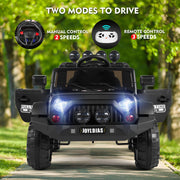 The 12V Electric Ride-On Jeep for Kids with LED Lights, Music, and Bluetooth Remote Control Introducing our new fantastic and functional ride-on car for your lovely children. This 12V Electric Ride-On Jeep is designed to provide an exhilarating driving experience for kids ages over 3 years. Equipped with a 2.4G remote control, parents can also enjoy the thrill of driving their children around. The comfortable seat and MP3 aux create an enjoyable environment for your children during playtime. With its 4-Wheels and spring suspension system, seat belt, and double lockable door design, this remote control ride on car ensures a comfortable and safe ride for your kids. It's the ideal gift for both outdoor and indoor adventures. Key Features: TWO MODES TO OPERATE - Kids can operate the electric car themselves through pedals and steering wheel to enjoy the 2 different speeds. Parents can control the car through the 2.4GHz remote control with three speeds. MULTIPLE AND JOYFUL FUNCTIONS - The built-in AUX port, USB, TF slot, music, and story, Bluetooth make your child's driving journey more enjoyable. SAFETY AND COMFORT - The slow start function reduces the impact of sudden acceleration on children. The door with safety lock and the seat with safety belt ensure the utmost safety and comfort for your child. DURABLE AND PORTABLE DESIGN - Made of non-toxic PP and iron, this electric vehicle is built to last. The wheels with a spring suspension system are suitable for all kinds of roads. The luggage handle allows for easy transportation. PERFECT GIFT - With a 12V7AH large-capacity battery, overcharge and overload protection, and 2 powerful motors, this ride-on car is a wonderful present for your child's birthday and Christmas. Product Specifications: Color: Black Battery: 12V7AH Charger: 12V700mA Motor: 390-16000*2 Play Time: 1-2 hours Loading Capacity: 66 lbs Speed: 2.9-3.5 km/h Size: 47''x28''x28'' Height Limit: 43.3'' Package Content: 1 x Electronic Toy Car 1 x Hardware Bag 1 x Manual Instruction 1 x Bluetooth Remote Control