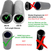 What sets ours apart from other competitors? We use DOM tubing in the collars of the arms AS WELL as the sleeve. Take a look at the sleeve pics. On the left is our Stryker sleeve. On the right is a competitors. We use heavy wall DOM tubing, with NO split seam, for our sleeves. The issue with the competitors sleeves is they are thinner wall and simply rolled over. This leaves a gap/seam. These arms take a lot of back and forth pressure. Over time, the other sleeves start to pull apart at that seam, creating a sharp edge inside the bushing, causing the bushing to shred from the inside. Our sleeves are DOM, with no seam, and a much heavier wall thickness. These are guaranteed!