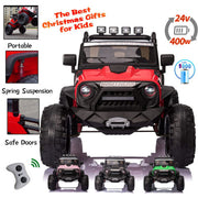The 2-Seater 400W Electric Kids Ride-On Truck with Parent Remote Control - 24V is the perfect gift for adventurous boys and girls aged 3-8 years. With its realistic appearance and high-performance 24V 2x200W Motor, this ride-on truck is designed to provide a thrilling and safe driving experience. The parental remote control allows parents to take control when needed, while the wear-proof EVA tires and reinforced seat belt ensure maximum safety and comfort for your little ones. Featuring soft start and soft brake technology, electron-assisted steering wheel, auto-reset overheat protector, and upgraded spring suspension system, this ride-on truck is built to enhance the driving experience for experienced users. The 2 spacious large size seats provide ample space for two kids to drive together, encouraging shared driving fun and bonding. The 24V battery and 2x200W motors deliver more power and driving ability compared to the 12V version. With a full load, the large battery can last up to 120 minutes of uninterrupted driving. The ride-on truck offers two driving modes - parental remote control and kids manual operate - giving you the flexibility to choose the most suitable mode for your child. All functions of the ride-on truck are centrally controlled for convenience. The high-bright LED headlights, tail lights, and searchlights add a cool factor to the driving experience, especially at night. The built-in music system with AUX port, USB port, Bluetooth, and MP3 capabilities provides endless entertainment for your kids. This ride-on truck is made with high-quality non-toxic PP material and is certified by ASTM & CPSIA for safety. It features a lockable double door design, LED searchlight, metal suspension, and high chassis for added safety and durability. The 4PCS 14" EVA wheels equipped with a strong metal suspension system can bear a maximum load of 130 lbs. With its vibrant color options of Red, Pink, Black, and Green, this ride-on truck is sure to be a hit with your kids. The recommended age range for this truck is 3-8 years, and it measures 48.5 inches x 34.7 inches x 31.5 inches in overall size. The battery type is 24V 9AH, and the motor type is 200W*2. The ride-on truck has a safe speed range of 1.8-4.9 mph. Get ready to ignite your child's sense of adventure with the 2-Seater 400W Electric Kids Ride-On Truck with Parent Remote Control - 24V. Order now and let the fun begin! Key Features: Realistic appearance and high-performance 24V 2x200W Motor Parental remote control for added safety Wear-proof EVA tires and reinforced seat belt for maximum safety and comfort Soft start and soft brake technology for a smooth driving experience Electron-assisted steering wheel for easy maneuvering Auto-reset overheat protector for added safety Upgraded spring suspension system for a comfortable ride 2 spacious large size seats for shared driving fun 24V battery and 2x200W motors for more power and driving ability Two driving modes - parental remote control and kids manual operate High-bright LED headlights, tail lights, and searchlights for a cool driving experience Built-in music system with AUX port, USB port, Bluetooth, and MP3 capabilities Certified by ASTM & CPSIA for safety Lockable double door design for added safety Metal suspension and high chassis for durability 4PCS 14" EVA wheels with strong metal suspension system Recommended age range: 3-8 years Product Specifications: Color: Red / Pink / Black / Green Recommended Age: 3-8 years Material: PP and ABS plastic, Metal Battery Type: 24V 9AH Motor Type: 200W*2 Suspension: Full-Metal Suspension Seat Size: 18 inch Wheels Size: 14 inch Maximum User Weight: 130 lbs Safe Speed: 1.8-4.9 mph Charging Time: 8-12 hours Run Time: 100-120 minutes Music Function: AUX & USB port / Bluetooth / MP3 / Built-in music Overall Size: 48.5 inches x 34.7 inches x 31.5 inches