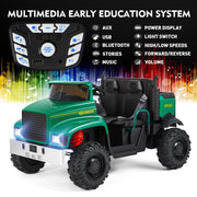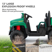 The 24V Electric Ride-On Truck with Trailer and RC Control - 3 Speeds for Double the Fun! Introducing the 24V Electric Ride-On Truck with Trailer and RC Control - 3 Speeds for Double the Fun! This ride-on truck is designed to provide kids with a fashionable and practical way to enjoy their childhood adventures. With its two-seater design and two separate safety belts, this ride-on truck is perfect for two kids under the age of 4 or a child aged 7 or 8. Let your little ones experience double the happiness with one purchase. The tiltable trailer and lockable tailgate add an extra element of fun, allowing kids to store their toys and snacks while they ride. With two modes of operation, this ride-on truck offers versatility for kids. They can operate the electric car themselves using the pedals and steering wheel, enjoying the thrill of driving at two different speeds. For added convenience and peace of mind, parents can also control the ride-on truck using the 2.4GHz remote control, which offers three different speeds. But that's not all! This ride-on truck is packed with multiple joyful functions to enhance your child's driving journey. It features a built-in AUX port, USB, TF slot, and Bluetooth, allowing kids to listen to their favorite music while they ride. The high-bright headlights add a cool factor, making kids feel super cool when driving at night. Designed with durability and safety in mind, this electric ride-on truck is made of non-toxic PP and iron materials. The wheels are equipped with a spring suspension system, making them suitable for all kinds of roads, including asphalt, brick, and cement roads. Safety is a top priority, and this ride-on truck is built to provide a secure and enjoyable experience for your child. The 24V Electric Ride-On Truck with Trailer and RC Control - 3 Speeds for Double the Fun! is the perfect gift for your child's birthday or Christmas. It features a 12V7AH*2 large-capacity battery with overcharge and overload protection, ensuring a long-lasting and safe ride. With 2 powerful motors, this ride-on truck offers a thrilling speed of 4.5-5.5km/h. Its large size of 47''x31''x27'' provides ample space for your child to ride comfortably. Plus, it has a loading capacity of 88 lbs, making it suitable for children of various sizes. The height limit is set at 43.3'', ensuring a secure fit for your child. Specifications: Color: Green Battery: 24V (12V7AH*2) Charger Input: 100-240V Charger Output: 28.8V 500mA Motor: 200W*2 Charge/Use Time: Charge 14h, Use 45-60 min Loading Capacity: 88 lbs Speed: 4.5-5.5 km/h Size: 47''x31''x27'' Height Limit: 43.3'' Package Content: 1 x Electronic Ride On Car 1 x Hardware Bag 1 x Manual Instruction 1 x Remote Control