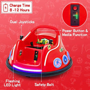The 360° Electric Bumper Car for Kids with Remote Control and LED Lights is the ultimate ride-on vehicle for your child's adventurous spirit. Get ready for endless fun and excitement as your little one takes control of this thrilling car. With its 360-degree spin design, your child can drive in all directions, adding a new level of excitement to their playtime. The remote control feature allows parents to ensure their child's safety while they enjoy the ride.This remote control ride on bumper car is not only fun but also safe and durable. It comes with a safety belt to secure your child during their ride. The soft bumper and pre-charge design provide added protection, allowing children to play safely. The bumper car has received ASTM and CPSIA certification, giving you peace of mind knowing that it meets the highest safety standards.The exciting lights on the front and side of the car create a captivating atmosphere for your child. The LED lights add a touch of wonder to their playtime, immersing them in a world of excitement. The charming cartoon pattern design adds an extra delight to their adventures.But the fun doesn't stop there! This bumper car also features a built-in music system and wireless connection. Let your child create their own soundtrack as they drive around, adding an extra level of excitement to their playtime. The bumper car also comes with a powerful 12V motor, ensuring a thrilling ride every time.This bumper car is the perfect gift for any child. Whether it's for birthdays, holidays, or any special occasion, this ride-on vehicle will bring joy and excitement to their life. Watch as their face lights up with delight when they receive this thrilling car.Key Features:- 360-degree spin design for driving in all directions- Remote control feature for safety and control- Exciting LED lights on the front and side- Charming cartoon pattern design for added delight- Built-in music system and wireless connection for a personalized soundtrack- Safety belt and soft bumper for secure and protected playtime- Powerful 12V motor for a thrilling rideSpecifications:- Color: Red- Material: PP, Metal- Overall Dimension: 29" x 29" x 17" / 73 x 73 x 43cm (L x W x H)- Seat Dimension: 13" x 8" / 33 x 20cm (L x W)- Net Weight: 16.5 Ibs / 7.5 kg- Load Capacity: 110 lbs- Suitable Age: 37-96 months- Battery: 12V 4.5AH- Charger: 12V 0.9A- Maximum Speed: 0.75~1.25 mph (1.2~2 km/h)- Charge Time: 8-12 hours- Certification: ASTM, CPSIAGet ready for a thrilling ride with the 360° Electric Bumper Car for Kids with Remote Control and LED Lights. Let your child's imagination run wild as they embark on exciting adventures with this ride-on car. Order now and bring joy and excitement to your child's life!