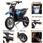 Get ready to ignite your teen’s sense of adventure with the thrilling 36V Ride-On Dirt Bike Motorcycle, a perfect fusion of power, speed, and style designed specifically for young riders eager to conquer off-road trails. This electric battery-powered motocross bike is crafted to deliver excitement with every twist of the throttle, making it the ultimate gift for teens who love the rush of the outdoors and the joy of a ride-on experience. Unleash Pure Power with Two Exciting Variants This ride-on dirt bike comes in two dynamic models, each with its own heart-pounding motor setup that promises to elevate your child’s riding fun: Black Model: Powered by a 350W brushless motor paired with a reliable 36V 7AH rechargeable battery system, this version delivers a smooth, robust ride that balances power and efficiency. The brushless motor ensures quieter operation and longer motor life, perfect for young riders seeking steady acceleration and durability. Blue Model: For those craving a little extra punch, the blue variant features a 500W brushed motor. This powerhouse ramps up performance, providing stronger torque and quicker responses, letting your teen experience a more intense off-road ride. Whether your teen prefers the sleek Black or the bold Blue model, each ride-on bike guarantees electrifying adventures and dependable performance. Experience Thrills at a Top Speed of 15.5 MPH With the ability to reach exhilarating speeds of up to 15.5 miles per hour, this electric motocross bike offers an exciting rush that will make your teen feel like a professional racer. Imagine their face lighting up as they zip across open fields or down dirt paths, mastering turns and jumps with confidence. The powerful motor combined with a 30-minute continuous run time ensures non-stop fun during every outing. Designed exclusively as a ride-on toy, this dirt bike delivers the perfect blend of safety and excitement — giving your teen a taste of real motocross action in a controlled environment. Built for Comfort and Control Riding isn’t just about speed; comfort and control are key to a fantastic experience. This ride-on dirt bike boasts a plush leather seat that pampers your teen during longer rides, making each journey a cozy adventure. The high-quality air-filled tires enhance grip and stability, offering superior traction on various terrains, from grassy knolls to gravel paths. Thanks to the front and rear metal spring suspension system, every bump and rough patch is cushioned, ensuring a smooth, comfortable ride that reduces fatigue and keeps your teen ready for more exploring. Intuitive Operation with Bright LED Visibility Safety and ease of use go hand in hand with this ride-on motorcycle. The bike features a bright LED headlight that not only adds to the cool factor but also improves visibility, making it perfect for late afternoon adventures or shaded trails. Controlling this ride-on toy is straightforward — your teen will quickly master the right-hand twist accelerator to manage speeds and the left-hand brake to come to smooth stops, promoting confidence and independence. Robust Specifications for Growing Riders Dimensions: Measuring a sturdy 49 inches in length, 24.8 inches in width, and 32 inches in height, this dirt bike is perfectly sized for teen riders to feel comfortable and in command. Weight Capacity: Designed to support riders up to 175 pounds, it comfortably accommodates teens up to 5 feet tall (60 inches), making it a ride-on companion that grows with your child. Recommended Age: Ideal for children aged 14 years and up, this dirt bike is built for those ready to take on the excitement of off-road motorcycling with safety and style. Bike Weight: At just 80 pounds, it offers a manageable size that’s robust yet light enough for easy handling and maneuvering. Why This Ride-On Dirt Bike is the Perfect Gift Imagine your teen strapping on their helmet and hitting the dirt trails with a gleam of determination and joy. This ride-on motorcycle isn’t just a toy — it’s an invitation to explore, challenge limits, and build confidence. The blend of powerful motors, comfortable seating, durable tires, and safety features means you’re gifting more than just a ride-on bike; you’re giving the gift of adventure, independence, and endless outdoor fun. Parents will appreciate the simple controls that enable safe operation, the robust construction that can handle everyday use, and the stylish design that makes it an instant favorite. Whether it’s a birthday, holiday, or special achievement, this ride-on dirt bike will create unforgettable memories for your teen as they master their new off-road ride. Choose Your Color, Choose Your Power Black Model Highlights: 350W Brushless Motor – quieter and more efficient for a smooth ride Powerful 36V battery for sustained performance Classic sleek black finish for a bold, commanding look Blue Model Highlights: 500W Brushed Motor – delivers extra torque and speed thrills Same robust 36V battery for reliable power supply Striking blue color with sporty vibes to stand out on any track Both variants are meticulously crafted to provide the same exceptional comfort and handling, ensuring your teen gets the perfect ride no matter which color they choose. Get Ready to Ride With this 36V ride-on dirt bike motorcycle, you’re not just buying a product; you’re opening the door to a world of excitement, skill development, and outdoor exploration. Perfectly sized for teens, loaded with safety and power, and built for comfort — this ride-on bike will inspire your child to take on new challenges and embrace the thrill of the great outdoors. Fuel your teen’s adventurous spirit today and watch them soar across the dirt trails with pride, speed, and endless smiles!