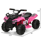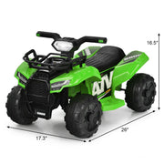 The 6V Kids Electric ATV Quad with LED Light and MP3 Player is the perfect ride-on toy for adventurous kids. With its easy-to-operate design, your little ones will have endless driving fun just like grownups do. Simply press the power button on the handle to accelerate the car at a safe speed of 1 mph. The switch allows for forward movement and parking, making it simple for kids to navigate.This ride-on quad is equipped with a rechargeable 6V 4Ah battery, providing up to 40 minutes of playtime on a full charge. The thickened wear-resistant PP wheels ensure smooth rides on various surfaces, whether it's indoors on a wood floor or outdoors on an asphalt road.Designed to resemble a real beach ATV, this mini ride-on car features an atmospheric LED headlight, a horn, and a front storage box for your child to store their favorite toys. It's the perfect gift for kids aged 18 months and older, with a maximum weight limit of 44 lbs.Safety is a top priority with this comfortable and stable ride-on car. Its low center of gravity ensures a safe and stable drive, while the wide seat fits kids' body curves for maximum coziness. The footrests comfortably accommodate your toddler's feet, ensuring a secure and enjoyable ride.But that's not all! This ride-on car is packed with multifunctional features. It has an MP3 player and a USB socket, allowing your child to bring their favorite songs and music along for the ride. It even memorizes a couple of songs and stories for educational purposes, making learning fun.Specifications:- Color: Black/Green/Pink/Red- Material: PP, steel- Product dimension: 17.3" x 26" x 16.5" (L x W x H)- Battery: 6V 4Ah- Charging time: 8-12 hours- Suitable age: 18-36 months- Maximum capacity: 44 lbs- Speed: 2 km/h- Net weight: 11 lbsOverview:- Boot the car by pressing the accelerate button on the handle- The speed reaches up to 2 km/h, ensuring a safe playtime for kids- Durable wheels suitable for wood floors, asphalt roads, and more- 4 big wheels provide stability and safety during the ride- Charging time requires 8-12 hours, providing 40 minutes of constant playtime- Realistic design inspired by a grownup's beach ATV for immersive role play- Front storage box allows kids to bring their favorite toys along for the ride- Side footrests and curved seats ensure comfortable seating- Includes MP3 player, USB socket, and music and story media functions for loads of fun- Weight limitation of 44 lbs for one riderWith the 6V Kids Electric ATV Quad with LED Light and MP3 Player, your child will embark on exciting adventures and create lasting memories. Get ready for hours of fun and exploration with this versatile and entertaining ride-on toy.