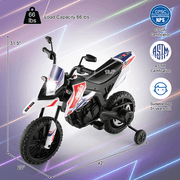 The Aprilia Licensed Kids Ride On Motorcycle with 2 Training Wheels in White is the perfect ride-on toy for adventurous young riders. With its cool appearance, realistic mudguard, and simulated exhaust pipe, this motorcycle will make your child feel like a real biker. It is available in three vibrant colors: Blue, Red, and White. The motorcycle is made of durable PP material and features a solid metal frame, ensuring long-term use and durability.Designed for children aged 3-8 years old, this ride-on motorcycle has a maximum load capacity of 66 lbs, making it suitable for a wide range of young riders. The non-slip handlebars ensure easy grip and control, while the comfortable seat provides a secure and comfortable riding experience.Equipped with two strong motors, this motorcycle can reach a safe speed of 3.4-3.7 mph, allowing your child to experience the thrill of a real ride. The 12V battery provides 1-2 hours of playtime and requires 8-12 hours of charging time. The hidden charging socket makes charging convenient and hassle-free.Safety is a top priority with this ride-on motorcycle. It has been certified by ASTM and CPSIA for higher security standards. The upgraded safety design includes two large wheels and two training wheels, ensuring a stable structure and helping young riders develop their balance and coordination skills. The spring suspension system provides a safe and steady riding experience, while the premium wheels ensure a smooth ride on various surfaces.This Aprilia Licensed Kids Ride On Motorcycle also features a song switch and a mode switch, allowing your child to enjoy music while riding. The light and power display add to the fun and excitement. The wireless function adds an extra level of convenience, allowing your child to ride freely without any restrictions.Overall Dimension: 42" x 22" x 31.5"Seat Size: 13.5" x 6"Suitable Age: 3-8 Years OldLoad Capacity: 66 lbsSpeed: 3.4-3.7 mphBattery: 12V 7AHCharger: 12V 0.9APlay Time: 1-2 HoursCharging Time: 8-12 HoursNet Weight: 25.5 lbsThis Aprilia Licensed Kids Ride On Motorcycle is the perfect gift for your little adventurer. It will not only provide hours of fun and excitement but also help develop their balance, confidence, and hand-feet coordination. Get ready for an unforgettable ride-on experience with this amazing motorcycle!