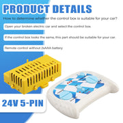 Transform your child’s ride-on experience with the all-new 24V Control Box Receiver 2.4G3104, a cutting-edge upgrade designed to bring power, precision, and seamless control to your children’s electric car or truck. This high-quality control box is the ultimate enhancement for parents and gift-givers seeking to elevate playtime into a thrilling adventure filled with safety, reliability, and hours of fun. Imagine your child confidently steering their ride-on car or truck with a remote control that responds instantly, thanks to the advanced 2.4GHz Bluetooth-compatible transmitter. This means no interference, clearer signals, and a smoother ride every time. Perfect for parents who want to share the joy of the ride while maintaining full control for extra safety. Why Choose the 24V Control Box Receiver? Powerful 24-Volt System: Designed specifically for 24V children’s electric vehicles, this control box delivers the robust energy needed to power larger, more dynamic ride-on cars and trucks, providing longer playtime and exciting speed capabilities. Advanced 5-Pin Connection: The 5-pin design ensures a stable and secure link between the receiver and the vehicle’s motor system, reducing glitches and enhancing the overall responsiveness of the ride-on. 2.4GHz Bluetooth-Compatible Remote: Enjoy wireless freedom with a remote control that operates at 2.4GHz frequency, offering a strong, interference-free connection that keeps your child’s vehicle safely within your command. Durable and High-Quality Materials: Crafted from premium plastic, the control box is built to withstand bumps, knocks, and the rigors of daily play, ensuring lasting performance and peace of mind for parents. Seamless Compatibility for Effortless Upgrades Not sure if this control box fits your child’s electric ride-on car or truck? The upgrade process is simple! Open the electric vehicle’s existing control box compartment and compare it with this 24V receiver. If the physical layout and connectors match, you’re ready to install a game-changing upgrade. Please note, due to manufacturing variations, the shell color of the control box is selected randomly, adding a surprise element to your purchase. What’s Included? 1 x 24V 5-Pin Control Box Receiver 1 x Remote Control (Please note: Remote requires 2 x AAA batteries, not included) Bringing Parents and Kids Together Through Play This control box upgrade transforms your child’s ride-on car or truck into a more interactive and manageable toy. As a parent, you can easily guide your child through their early driving adventures, boosting their confidence and independence while ensuring their safety. The responsive remote control allows you to limit speed, stop the vehicle remotely, and make adjustments on the fly, making every ride a safe and joyous journey. For your little one, the upgraded electric vehicle becomes more than just a toy—it becomes their personal chariot for exploration. They’ll feel like a real driver, steering through imaginary worlds as the ride-on car or truck zips effortlessly with enhanced control and power. The sturdy build and reliable electronics allow them to embark on countless adventures, creating memories that last a lifetime. Perfect for Various Ride-On Vehicles This versatile control box is ideal for a wide range of children’s ride-on cars and trucks operating on a 24V power system. Whether your child’s vehicle is a sleek mini car or a rugged toy truck, this receiver and remote combo delivers consistent performance and control. It’s a smart investment to breathe new life into an existing ride-on vehicle or to upgrade a gift for any young driving enthusiast. Key Specifications: Voltage: 24 Volts Connection Type: 5-Pin Control Box Remote Frequency: 2.4GHz Bluetooth-compatible Material: Durable Plastic Remote Battery: Requires 2 x AAA (not included) Give your child the gift of thrilling and controlled rides with the 24V Control Box Receiver 2.4G3104. This upgrade isn’t just a replacement part—it’s a gateway to unforgettable play sessions, safer driving practice, and the joyful bond between parent and child. Whether upgrading a beloved ride-on car or truck, this control box brings new life and adventure to every turn of the wheel. Step into the driver’s seat of imagination and fun. Upgrade today and watch as your child’s electric car or truck comes alive with power, control, and endless excitement!