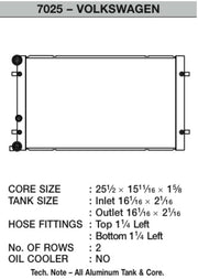 CSF has over 5 decades of experience manufacturing radiators. So when it comes to keeping your engine cool and your MK4 VW running at its best, a CSF High-Performance All-Aluminum Radiator is the obvious choice. Designed to perform on the street or at the track, a performance radiator is a must-have for both high horsepower builds as well as race vehicles which need added cooling performance in motorsports environments. This radiator features a 2-Row core with CSF's exclusive B-Tube Technology: Unlike a regular oval shape "O" type radiator tube, CSF uses a specially engineered tube in the shape of a "B". These "B-tubes" are carefully formed and then brazed over the seam to seal. CSF is able to use thinner and lighter aluminum material (with better cooling efficiency) because this design is actually stronger than normal "O" shape tubes that are welded. The design (inlet in the middle of the tube that is seam brazed) increases the heat transfer surface area of the tubes by approximately 15% over regular tubes - producing the efficiency of two smaller tubes vs. one large tube within the same space criteria. With "B-tubes" you are able to get "dual liquid laminar flow". CSF also uses ultra efficient multi louvered fins that are carefully and precisely aligned to maximize airflow through each radiator core. Fin specifications are carefully measured and calculated for each application, and tested for maximum heat rejection efficiency in our wind-tunnel lab.