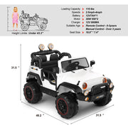 The Electric Battery Kids Ride-On Car Truck with LED Lights, MP3 Player, and Remote Control - White Introducing our new 12V Children Electric Ride-On Car, a thrilling and adventurous toy that will bring endless joy to your little ones. This ride-on car is designed to captivate their imagination and provide hours of entertainment. Whether they want to cruise around the neighborhood or explore the great indoors, this rc ride on car is the perfect companion for their adventures. Key Features: MP3 player: Connect your device via USB to play your favorite music or stories, creating a personalized and immersive experience for your child. 2 Modes Design: This ride-on car can be operated by the foot pedal and steering wheel, allowing your child to take control of their own adventure. Alternatively, parents can use the 2.4G Bluetooth remote control for added convenience and safety. Safety: Equipped with a spring suspension system, this ride-on car ensures a smooth and comfortable ride, both indoors and outdoors. The double door design and parental remote control provide an extra layer of safety for your child. Speeds: With 2 forward speeds and 2 reverse speeds controlled manually, as well as 3 speeds controlled by the remote control, your child can enjoy a range of thrilling speeds. The ride-on car can reach speeds of 2.5 mph to 4 mph, providing a thrilling and exhilarating experience. Product Specifications: Color: White Battery: 12V7AH*1 Motor: 12V (2 x 3DW) Charger: 12V 1000MA (Smart Charger) Maximum Load: 88LBS Charging Time: 8-12 hours (automatically controlled) Run Time: 1 - 2 hours Car Speed: 2.5 mph - 4 mph Product Size: 43.3"x27.3"x32.3" Seat Size: 13.78" x 6.7" x 8.66" Applicable Age: 3+ years old Assembly Required: Yes Music Function: AUX/ USB / TF Cards (USB Flash Drive/ Mobile Phone etc.) Package Content: 1 x Electronic Toy Car 1 x Hardware Bag 1 x Manual Instruction 1 x Bluetooth Remote Control Get ready for a thrilling and unforgettable ride-on car experience with our Electric Battery Kids Ride-On Car Truck with LED Lights, MP3 Player, and Remote Control - White. Order yours today and let the adventures begin!