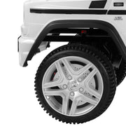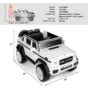 Product Description The Electric Ride-On Car for Kids with Music, LED Lights, and Remote Control - 3 Speeds - White Introducing our new and exciting Electric Ride-On Car for Kids with Music, LED Lights, and Remote Control. This officially licensed Mercedes-Benz G650S ride-on car is perfect for children ages over 3 years. It provides a thrilling and enjoyable experience for your little ones as they cruise around in style. Equally enjoyable for parents, the 2.4G remote control allows you to take control and drive your children around. With its comfortable seat and MP3 AUX, your children will have a delightful environment to play in. The 4-wheels with a spring suspension system, seat belt, and double lockable door design ensure a safe and comfortable ride for your kids. This rc ride on car is the ideal gift for both outdoor and indoor playtime adventures. Features: Two Modes of Operation: Kids can operate the electric car themselves using the pedals and steering wheel, enjoying the thrill of driving at 2 different speeds. Parents can also take control using the 2.4GHz remote control, which offers three different speeds. Multiple and Joyful Functions: The built-in AUX port, USB, TF slot, music, and story options, as well as the horn, enhance your child's driving journey, making it even more enjoyable. The high-bright LED lights add a cool factor, especially when driving at night. Safety and Comfort: The slow start function ensures a smooth and gentle acceleration, reducing the impact on children. The door with a safety lock and the enlarged seat with a safety belt guarantee utmost safety and comfort for your child. Durable and Portable Design: Made of non-toxic PP and iron, this electric ride-on car is built to last. The wheels with a spring suspension system are suitable for all kinds of roads, including asphalt, brick, and cement. The luggage handle makes it easy to transport the car outdoors. Perfect Gift: Equipped with a 12V 7AH large-capacity battery with overcharge and overload protection, as well as 2 powerful motors, this ride-on car is designed to provide endless fun. With a size of 46"(L) x 28"(W) x 23"(H) and a weight capacity of 66 lbs, it is suitable for children over 3 years old. The speed ranges from 2 to 4.5 KM/h. The Mercedes-Benz kids car is the perfect present for birthdays and Christmas. Specifications: Color: White Battery: 12V7AH*1 Charger: 12V900MA Car Speed: 2KM/H-4.5KM/H Motor: Two driver motor (12V30W*2RPM10000), Steering motor (12V20W*1RPM6000) Load Capacity: 66LBS Product Size: 46"(L) x 28"(W) x 23"(H) Seat Size: 15"(W) x 7"(D) Backrest Size: 15"(W) x 9.4"(H) Car Bucket Size: 17.3"(L) x 4.3"(W) x 5.3"(D) Applicable Age: 3+ years old Assembly Required: Yes Net Weight: 40LBS Charging Time: 8-12 hours (automatically controlled) Music Function: AUX/USB/TF Cards (USB Flash Drive/Mobile Phone etc.) Remote Controller: Forward, reverse, brake, left, right, speed indicator, speed select Package Content: 1 x Electronic Toy Car 1 x Hardware Bag 1 x Manual Instruction 1 x Bluetooth Remote Control