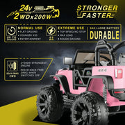 The Electric Ride-On Jeep Truck for Kids: 12V/24V ATV Toy with Four-Wheel Drive Introducing the Electric Ride-On Jeep Truck for Kids: 12V/24V ATV Toy with Four-Wheel Drive, the ultimate toy for adventurous children. This ride-on car combines power, safety, and endless fun to create an unforgettable driving experience. With multiple variants to choose from, there is a perfect option for every child. Type 1: 12V 2x35W Electric Ride On Car ATV Quad Color: Pink/Black/Blue/White Motor: 35W*2 Battery: 12V - 4.5AH Material: PP, Iron Net Weight: 21.6 lbs Loading Capacity: 68 lbs Overall Dimensions: 34.6" L X 18.1" W X 20.1" H Recommended for Kids: 2-8 years old Speed: Low speed of 1.5mph, high speed of 2.8mph Key start, high/low speed, USB, MP3 interface, power display, volume adjustment, slow start Charging time: 6-8 hours Long battery life - up to 60-90 minutes (Based on child weight) Certification: ASTM /F963, FCC, CE, ROHS The Type 1 Electric Ride On Car ATV Quad is perfect for young adventurers. Featuring a sleek design and vibrant color options, this ride-on car will capture the imagination of any child. The advanced slow start technology ensures a safe and comfortable driving experience, while the kids-friendly seat provides ultimate comfort. With variable driving speeds and directions, your child can easily navigate their surroundings just like a real car. The authentic appearance, complete with LED headlights, adds to the excitement and fun. Equipped with wear-resistant wheels, this ATV can conquer any terrain, both indoors and outdoors. Let your child's imagination run wild with the Type 1 Electric Ride On Car ATV Quad. Type 2: 12V 2*30W 2-Seaters Electric Ride On Truck Car Color: Pink/Black/White/Red Recommended Age: 3-7 years Material: PP and ABS plastic, metal Battery Type: 12Volt 7AH Motor Type: 30W * 2 Maximum User Weight: 67 lbs (30 kg) Maximum Speed: 3-5 km/h (3 mph) Charging Time: 8-12 hr Run Time: 2-2.5 hours (depending on the child's weight and speed) Music Function: AUX & USB port / Bluetooth / built-in music Controller Batteries: 2 AAA batteries (not included) Overall Size: 38.5 inches (L) x 23.5 inches (W) x 26 inches (H) The Type 2 Electric Ride On Truck Car is the perfect gift for your aspiring little driver. With its realistic design and high-performance 30W dual drive motor, this ride-on car provides an immersive driving experience. The two driving modes, including a parent-child remote control mode, allow for safe and independent operation. The built-in music player, AUX/USB ports, and Bluetooth connectivity add to the fun and entertainment. The multifunctional control panel, complete with an oversized color LED display, allows for easy operation and customization. With upgraded configurations and shock absorption, this ride-on truck ensures a smooth and comfortable ride. Safety is guaranteed with a two-point seat belt, lockable double doors, and shock-absorbing tires. Let your child's driving dream come true with the Type 2 Electric Ride On Truck Car. Type 3: 24V 2x200W 2 Seater Electric Ride On Truck Two modes design: Parent-child remote control mode and steering wheel and pedal power mode Powerful 24V battery and realistic design Adjustable seat belts, bright LED headlights, lockable double doors, and impact-absorbing shock absorbers Connect Your Music: AUX input, USB port, and Bluetooth function Color: Pink/Black/Yellow/Green/Blue/White Recommended Age Range: 3-9 years Charging Time: 8-12 hr The Type 3 Electric Ride On Truck is the ultimate choice for adventurous kids. With its two modes design, parents can control the car through the remote control or children can independently operate it using the steering wheel and pedals. The powerful 24V battery and realistic design make this ride-on truck a thrilling experience. Safety features such as adjustable seat belts, bright LED headlights, lockable double doors, and impact-absorbing shock absorbers ensure a secure and comfortable ride. Connect your music through the AUX input, USB port, or Bluetooth function to enhance the driving pleasure. Available in a variety of vibrant colors, the Type 3 Electric Ride On Truck is suitable for children aged 3-9 years. Let your child's imagination roam with the Type 3 Electric Ride On Truck.