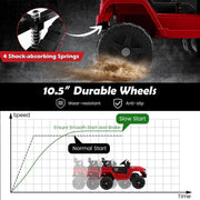The Electric Ride-On Truck for Kids with Remote Control and Headlights is the ultimate toy car for your little adventurer. This ride-on truck is designed to provide endless fun and excitement, while also ensuring the safety of your child. With its 12V battery and powerful motor, this electric toy car is ready to conquer any terrain.One of the key features of this remote control ride on truck is its versatile control options. Children can operate the car using the accelerator pedal, manual control buttons, and steering wheel. For added convenience and peace of mind, parents can also use the included remote control to control the car. The remote control features 3 speeds and allows parents to maintain control from a distance of up to 98.4 ft.Safety is a top priority with this ride-on truck. It is equipped with a seat belt and safe door locks to protect your child while they enjoy their adventure. The slow start function ensures a gradual start and smooth braking, providing a safe and comfortable ride. The 4 shock-absorbing springs on the anti-slip and durable wheels further enhance the safety and stability of the car.Not only is this ride-on truck safe, but it also offers a fun and entertaining experience. It is equipped with a USB port and an Aux jack, allowing your child to connect their device and enjoy their favorite songs while riding. The car also features a preset story and music buttons on the steering wheel for added entertainment. The bright headlights not only make the car look cool, but also light the way ahead during nighttime adventures.The Electric Ride-On Truck for Kids with Remote Control and Headlights is an ideal gift for children ages 3-7. It not only allows them to explore the outside world and satisfy their curiosity, but also helps improve their hand-eye coordination. This ride-on truck is made of high-quality steel and plastic, ensuring durability and longevity.Specifications:- Color: Red- Material: Steel, Plastic- Overall dimension: 39" x 26" x 26" (L x W x H)- Seat size: 12.5" x 7.5" (L x W)- Net weight: 29.7 lbs- Weight capacity: 66 lbs- Suitable age: 3-7 years old- Battery: 12V 4.5AH- Charger: 12V 500mA- Charge time: 8-12 hours- Speed: 1.5-2.8 mphThe Electric Ride-On Truck for Kids with Remote Control and Headlights is the perfect toy car for your little one. It offers a thrilling and safe ride, with various control options and safety features. The added entertainment features, such as the ability to play music and the bright headlights, make this ride-on truck even more appealing. Don't miss out on the opportunity to give your child the ultimate adventure with this ride-on truck.