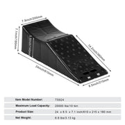 Premium Tandem Wheel Ramp Discover the Ultimate Tandem Wheel Ramp for Your Car, Truck, or RV Every vehicle owner knows the importance of safe, reliable maintenance tools. Now you can elevate your routine with our top-of-the-line tandem wheel ramp. Engineered to support up to 20,000 lbs, this ramp combines strength, durability, and smart design to make tire changes, inspections, and underbody work – from oil changes to brake checks – easier than ever. Whether you’re a DIY enthusiast working in your garage or a professional mechanic on the go, this ramp is the ideal companion to unlock new heights of safety and convenience. Why Choose Our Tandem Wheel Ramp? Imagine pulling into your driveway or workshop, grabbing your tandem wheel ramp by its built-in handle, and effortlessly setting up your car or truck for maintenance – all in less time than it takes to brew a cup of coffee. Here’s what makes our ramp stand out: Extraordinary Load Capacity: With a maximum load rating of 20,000 lbs (10 tons), this ramp handles everything from midsize vans and pickups to full-size motorhomes. No worries about weight limits or bending under pressure. Quick & Easy Elevation: Simply position the ramp on a level surface and drive your wheels up. In one smooth motion, your vehicle rises 5½ inches, offering the perfect height for quick inspections, tire swaps, or brake adjustments. Premium Polypropylene Construction: Crafted from impact-resistant, high-grade PP material, the ramp resists high temperatures, oil, road salts, and cracks. It stays sturdy under repeated use and heavy loads, giving you years of reliable service. Anti-Slip Concave Design: The gentle curved channel guides your tire into position and cradles it securely. Textured surfaces and gradual incline angles ensure maximum traction, so your car, truck, or RV won’t slip during elevation. Zigzag Friction Base: The ramp’s bottom edge features an innovative zigzag pattern that grips the ground and prevents water buildup. You can drive on wet driveways or garage floors without fearing a slide. Compact & Portable: At just 24 inches long, 8½ inches wide, and 7.1 inches high, this ramp stows neatly in your trunk, garage shelf, or service area. The built-in handle makes it simple to carry to remote job sites or roadside emergencies. Built for Convenience, Crafted for Safety When you choose our tandem wheel ramp, you invest in peace of mind. No more leaning on jacks that might sink into soft ground or relying on blocks that could shift. This ramp’s sturdy profile and stable footing let you work underneath your vehicle with confidence—whether you’re changing oil, rotating tires, or inspecting the exhaust system. The concave tire channel ensures perfect wheel alignment, reducing the chance of misplacement. And thanks to the ramp’s robust polypropylene build, you won’t have to worry about cracks, warping, or deformation even in extreme weather. Key Benefits at a Glance Effortless Setup: No tools or assembly required. Position, drive on, and you’re ready to work. Optimized Maintenance Height: 5.5 inches of lift creates ample space for underbody access without excessive rocking or tilting. Universal Compatibility: Suitable for a wide range of tandem wheel vehicles – from light-duty cars to heavy-duty trucks and motorhomes. Long-Term Durability: High-grade PP resists impact, UV rays, and chemicals, ensuring longevity even under harsh working conditions. Enhanced Traction: Textured, concave surface and zigzag base prevent slippage, safeguarding both you and your vehicle. Space-Saving Design: Lightweight 6.8 lb construction with a convenient handle for stashing and transporting. Specifications Model Number: TS924 Maximum Load Capacity: 20,000 lbs (10 tons) Lift Height: 5.5 inches Dimensions: 24″ (L) × 8.5″ (W) × 7.1″ (H) Net Weight: 6.8 lbs Ideal for Every Vehicle Maintenance Task Whether you’re a professional mechanic or a weekend warrior, this tandem wheel ramp transforms the way you work on your car, truck, or RV. Use it for: Routine oil and fluid changes Tire rotations and brake inspections Underbody repairs and exhaust checks Detail work and cleaning beneath the chassis Emergency roadside repairs How to Use Your Tandem Wheel Ramp 1. Ensure your driveway or garage floor is clean, level, and free of debris. 2. Position the ramp so the gentle slope faces your tire. 3. Slowly drive forward until the tire seats securely in the concave channel. 4. Set the parking brake and place wheel chocks behind the rear wheels. 5. Enjoy 5.5 inches of safe, stable elevation for all your maintenance needs. Make Maintenance Effortless Today Step into a new era of vehicle care with our premium tandem wheel ramp. Combining unmatched strength with smart, user-friendly design, it’s the perfect tool for anyone who values safety, efficiency, and quality. Keep your car, truck, or RV running smoothly and looking its best—order yours today and experience the difference professional-grade equipment makes.