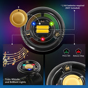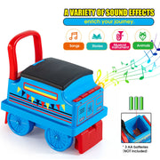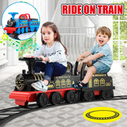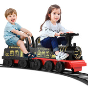 The Interactive 6V Electric Kids Train Set with Track, Carriage, Lights, Whistle, Music, Storytelling, and Storage is a delightful ride-on toy that will bring endless joy and adventure to your little ones. With its retro design and practical features, this train set is sure to captivate their imagination and provide hours of entertainment.Key Features:- Retro Ride On Train with Curved Tracks: The JOYLDIAS ride-on train features a 6V rechargeable battery and comes with 67.3-inch diameter curved tracks. Your little ones can enjoy a smooth and exciting ride along the tracks, experiencing the thrill of being a train conductor.- Secret Storage: The hollow design under the seat provides a convenient storage space for toys and snacks, keeping everything within reach during their ride-on adventures. This clever feature also maintains the train's streamlined appearance.- Fun Train for Kids: With the simple press of a switch, the toy train comes to life. Your kids can control the train's movements with the steering wheel, turning and stopping as they please. The train even imitates the whistle of a real train, creating an immersive and exciting experience. Plus, the 3-color lights flash simultaneously, adding a cool visual effect.- Safe and Stable Design: Safety is a top priority, which is why this ride-on train is made from non-toxic and odorless PP material, ensuring the well-being of your little ones. The train is equipped with 6 stable wheels, a backrest, and accessories in the front and rear, providing stability and security during their ride.- Pleasant Journey: The carriage of the train is filled with delightful surprises. It features built-in songs, stories, musical instruments, and animal sounds, making your kid's driving journey even more enjoyable and engaging.Product Specifications:- Color: Available in Black or Blue- Train Size: 20.7"x8.4"x13.4''- Carriage Size: 13.3"x8.4"x9.5"- Battery: 6V4A- Speed: 0.8-1.5km/h- Height Limit: Up to 39 inches- Weight Capacity: Up to 132lbs.- ASTM, CPC CertificationPackage Includes:- 1 x Electric Locomotive- 1 x Carriage- 16 x Curved TracksPlease note that the shipment of this train set will be split into 2 separate packages, ensuring that all components are safely delivered to you.With the JOYLDIAS Interactive 6V Electric Kids Train Set, your little ones will embark on thrilling adventures, honing their motor skills and imagination. Let them experience the joy of being a train conductor as they ride along the curved tracks, listening to the whistle, music, and stories. Order now and watch their faces light up with excitement!