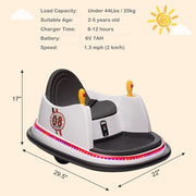 The Interactive LED Bumper Car for Kids and Toddlers with Remote Control - White is the ultimate ride-on toy that will bring endless fun and excitement to your little ones. This electric bumper car, made with high-quality PP and steel materials, is ASTM-certified for safety and durability. Whether your child wants to take control manually or you prefer to guide them with the remote control, this remote control ride on bumper car offers both options for a thrilling and safe experience.Key Features:- Colorful flashing lights create a vibrant and dynamic atmosphere as your child rides around.- The bumper car can spin a full 360 degrees, controlled effortlessly by the simple joystick or remote controls.- Parents have the flexibility to let their child drive manually or use the remote control to ensure their safety when necessary.- The ride-on car includes a rechargeable 6V battery, providing 1-2 hours of non-stop riding fun.- The safe soft start system ensures a smooth and secure ride for your little one.- An adjustable seat belt is included for safe and comfortable use.Product Specifications:- Color: White- Brand: Leadzm- Theme: Cars- Material: PP, Steel- Speed: 1.3 MPH (2km/h)- Maximum User Weight: 44 Lbs (20kg)- Recommended Age: 2 to 5 Years Old- Charging Time: 8-12 hours (18 hours for the first time)- Use Time: 1-2 hours- Battery Type: 6V 7AH- Product Dimension: 29.5” x 22” x 17” (L x W x H)Package includes:- 1 x Ride-on Bumper Car- 1 x Instruction Manual- 1 x Remote ControlLet your child embark on thrilling adventures with the Interactive LED Bumper Car for Kids and Toddlers with Remote Control - White. With its vibrant lights, easy controls, and adjustable seat belt, this ride-on car guarantees a safe and enjoyable experience for children aged 2 to 5 years old. Order now and watch your little one's face light up with joy as they cruise around in their very own bumper car.