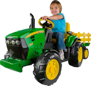 The John Deere Ground Force Tractor and Trailer Set The John Deere Ground Force Tractor and Trailer Set takes outdoor play excitement to the next level! Kids will delight in driving this ride-on tractor while listening to their favorite tunes on the working FM radio. With its extra large stake-side detachable trailer, children can load up their treasures and deliver them in style. The adjustable seat with flip-up armrests ensures a comfortable ride for kids of all sizes. Parents can control the speed with the 2nd gear lockout feature, making it safe for beginners. This miniature tractor is perfect for children aged 2-14 and offers a thrilling and adventurous playtime experience. Key Features: 2 speeds plus reverse; 2¼ & 4½ mph (4½ mph lockout for beginners) Accelerator pedal with automatic brakes Farm tractor wheels provide traction on grass, dirt, gravel, or pavement Extra large stake-side trailer Working FM radio Adjustable seat with flip-up armrests Product Specifications: Sub Brand: John Deere Style: Standard Material: Plastic Item Weight: 50 Pounds Item Dimensions LxWxH: 24.5 x 26.5 x 67.5 inches Size: Miniature Recommended Age Range: 2-14 Made in the USA, the John Deere Ground Force Tractor and Trailer Set is crafted with the highest quality using domestic and global components. This durable and reliable ride-on toy is perfect for outdoor adventures on grass, dirt, gravel, or pavement. Let your child's imagination run wild as they load up the extra large trailer and embark on exciting missions. The 12-volt rechargeable battery and charger are included, ensuring hours of uninterrupted playtime. Get ready for endless fun and excitement with the John Deere Ground Force Tractor and Trailer Set!
