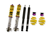 KW V2 INOX-LINE coilovers are the perfect solution for drivers who want more than just outstanding looks and adjustable ride height. In addition to stainless steel coilover struts, and corrosion-resistant components built for long term durability, KW V2 coilovers utilize TVR-A (Twin Valve Rebound - Adjustable) technology that allow Adjustment of the rebound damping characteristics with 16 clicks so you can fine tune the ride comfort or performance to your satisfaction. As with all KW coilovers our engineers develop vehicle specific damper settings that undergo comprehensive testing on the Nurburgring Nordschleife and in our KW 7-post Driving Dynamic Test Center. With a KW coilover kit the driving experience is more dynamic and direct. With the rebound adjustability you have a more direct influence on the handling or comfort of the car. With 16 precise clicks you can adjust the KW dampers (more firm or more comfortable) without affecting the compression damping fine-tuned by our engineers. The two-stage, patented TVR-A (Twin Valve Rebound - Adjustable) technology enables a small volume of oil flow through an adjustable, conically shaped, low-speed bypass during low damper speeds, while at high damper speeds, the main rebound stage valve opens allowing a larger volume of oil to flow. This provides a big improvement in terms of ride comfort without influencing the high-speed range. There are 16 precise clicks available for individual settings, so you can choose between more comfort or more body control. With KW V2 coilovers you can achieve maximum lowering within an approved lowering range that ensures a proper functioning suspension and adequate travel after your car is lowered. Even after years of use you can easily adjust the ride height thanks to the dirt resistant trapezoid thread and composite adjustment collar.