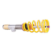 Is your factory sport suspension too firm? Do you want a sporty look and driving dynamics without having to compromise comfort? KW V2 comfort coilovers take the already stellar ride and reputation of KW suspensions coilover systems to the next level of comfort. Designed specifically to maximize comfort KW V2 Comfort coilovers provide a subtle lowering with adjustable ride height and rebound damping adjustability allowing the handling or the comfort to be individually tailored as desired via the integrated rebound adjustment knobs. KW V2 Comfort coilovers offer the perfect compromise of driving dynamics and ride comfort. With the KW V2 Comfort coilover kit, your comfort-oriented driving pleasure is the focus. That's why our test engineers evaluate the setups on numerous highways and country roads with various road surface types. The KW V2 Comfort coilover kits are suitable for all drivers who want to combine the joy of a decent lowering with driving comfort. With the 16-click adjustable rebound damping (TVR-A-technology), you can tune the KW dampers on the KW V2 Comfort coilover kits to make it more comfortable or sportier. The two-stage, patented TVR-A (Twin Valve Rebound - Adjustable) technology enables a small volume of oil to flow through an adjustable, conically shaped, low-speed bypass during low damper speeds, while in the case of higher damper speeds, the main rebound stage valve opens allowing a larger volume of oil to flow. This provides a big improvement in terms of ride comfort without influencing the safety-relevant high-speed range. There are 16 precise clicks available for individual settings, so you can choose between more comfort or more body control. The KW V2 Comfort coilovers, made using INOX-LINE stainless steel technology, enables a vehicle-specific lowering within the tested adjustment range of 10 to 40 mm.