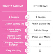 The Licensed Toyota Tacoma Ride-On Car for Kids with MP3 Player - 12V Electric Vehicle by Kimbosmart Looking for the perfect gift for your child? Look no further than the Licensed Toyota Tacoma Ride-On Car for Kids with MP3 Player. This ride-on car is designed to provide a lifelike driving experience for your little one, with working LED headlights and two operated doors. The spacious seat comes with an adjustable belt to ensure their safety while they have fun. With a top speed of 3.5 km/h, this rc ride on car offers the perfect balance of excitement and safety. The 12-volt battery provides plenty of power for hours of playtime. Plus, with the included Parent Remote Control, you can easily operate the car yourself, giving you peace of mind. But that's not all! This ride-on car also features a low battery reminder function, so you can avoid excessive battery consumption. And with its sleek design and realistic details, like the Toyota Tacoma branding, your child will feel like a real road adventurer. Key Features: Working LED headlights and two operated doors Spacious seat with adjustable belt Real foot pedal acceleration Top speed of 3.5 km/h Parent Remote Control included Low battery reminder function Specifications: Color: Black/Pink/White Recommended Ages: 37 months-72 months Weight Capacity: under 62 lbs Max Height: 48 inches Battery: 12V 7Ah Material: PP and Iron Motor: 25Wx2 Speed: 1-3.5 km/h Remote Control Range: 65ft-98ft (20M-30M) Playtime: 40-50 mins Charge Time: 8 - 12 hours Seat Size: 15x8 inches Package Dimension: 40.5x23x13 inches Product Dimension: 41.3 x 25.6 x 20.5 inches Gross Weight: 43 lbs Net Weight: 31.5 lbs Charge Input: AC110V-240V Charge Output: DC12V/0.9A Package Includes: 1 x Kids Car 1 x Charger 1 x Manual Give your child the gift of adventure with the Licensed Toyota Tacoma Ride-On Car for Kids with MP3 Player. Order yours today!