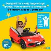 The Magic Cars® 12V Lamborghini Aventador Style SVJ Ride-On Car for Kids - Electric Vehicle With Wireless Parental Control is the ultimate ride-on toy for your adventurous little ones. With its realistic design and powerful 12V battery, this remote control ride on car provides a thrilling driving experience that will make your kids feel like they're behind the wheel of a real Lamborghini.This ride-on car features fully functioning wheels with spring suspension, allowing your kids to navigate various terrains with ease. The working LED headlights add to the realistic experience, making your kids feel like they're driving a real car.The 12V Licensed Lamborghini Aventador SVJ Ride-On Car for Kids - Electric Vehicle offers two modes of operation. In the parental remote control mode, you can take full control of the car using the remote control. This allows you to ensure your child's safety while they enjoy their ride. In the battery-operated mode, your child can use the pedal and steering wheel to operate the car themselves, giving them a sense of independence and autonomy.Safety is a top priority with this ride-on car. It includes double doors and seat belts to keep your child secure during their adventures. The four wear-resistant wheels are made of superior PP materials, ensuring durability and eliminating the hassle of inflating tires. This means a safer and smoother driving experience for your little ones.But the fun doesn't stop there! The 12V Licensed Lamborghini Aventador SVJ Ride-On Car for Kids - Electric Vehicle is equipped with a range of exciting features. It has forward and reverse functions, as well as two speeds that can be adjusted using the remote control. Your kids will also love the MP3 player, AUX input, and USB port, which allow them to connect their devices and play their favorite music or stories while they ride.This ride-on car is not only fun, but it also makes for a perfect gift. Whether it's for a birthday or a special occasion, this ride-on car will bring joy and excitement to your child's life. The overall dimensions of the car are 100x65x72cm (39.4x25.6x28.3 inches), making it suitable for children aged 3-7 years old.Key Features:- Realistic driving action with controls sized for small hands- Powerful 12V battery that runs up to 2 hours on a full charge- Fully functioning wheels with spring suspension for a realistic multi-terrain experience- Working LED headlights for added realism- Two modes of operation: parental remote control mode and battery-operated mode- Double doors and seat belts for safety- Four wear-resistant wheels made of superior PP materials for durability- Forward and reverse functions with adjustable speeds- MP3 player, AUX input, and USB port for music and stories- Perfect gift for kids on various festivals or anniversariesProduct Specifications:- Color: Red / Yellow / Green- Recommended Age: 3-7 years- Material: PP and ABS plastic, metal- Battery Type: 12V 7AH- Motor Type: 2*35W- Suspension: Spring Suspension- Driving Modes: Manual and Remote- Seat Size: 16 inches- Wheels Size: 8 inches- Maximum User Weight: 67 lbs- Safe Speed: 1.8-3 mph- Charging Time: 8-10 hours- Run Time: 2-2.5 hours- Music Function: AUX & USB port / Built-in music & Story- Overall Size: 43 x 24 x 17 inchesWith the 12V Licensed Lamborghini Aventador SVJ Ride-On Car for Kids - Electric Vehicle, your child will embark on exciting adventures and create lasting memories. Get them this amazing ride-on car today and watch their imagination soar!