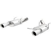 The MagnaFlow 2011-2012 Ford Mustang Street Series Axle-Back Performance Exhaust System 15593 brings enhanced engine sound and dyno-proven performance to your 5.0L, 5.4L 2011-2012 Ford Mustang with a healthy helping of our deep, resonant signature exhaust note at Moderate exterior and Mild interior sound levels. Thanks to its durable, corrosion resistant stainless steel design, this Ford Mustang exhaust system will handle whatever tarmac you decide to leave your mark on. This performance exhaust kit features an axle-back layout designed to replace your Ford Mustang's exhaust system from near the rear axle on back. With its fast-flowing, mandrel bent 3in. main piping and 2 Straight-Through mufflers ending in a Dual Split Rear exit with 4in. Polished Welded-On Double Wall Angle Cut Folded Edge tips, your ride will be sounding as awesome as it looks. Extensive 3D scanning during development has resulted in a direct-fit design that you can easily install yourself. 15593 is produced using CNC precision robotic manufacturing techniques and is backed by MagnaFlow's 1-year limited finish warranty and limited lifetime construction warranty.