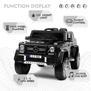 The Mercedes-Benz Electric Ride-On Car for Kids with 3 Speeds, LED Lights, and Remote Control - Black Introducing the Mercedes-Benz Electric Ride-On Car for Kids with 3 Speeds, LED Lights, and Remote Control - Black. This officially licensed Mercedes-Benz G650S ride-on car is the perfect toy to give your child the mobility they desire while improving their fitness, coordination, and balance. With its multiple features and safety measures, this rc ride on car offers endless joy and excitement for your little one. Key Features: Two Modes of Operation: Kids can independently operate the electric car through the pedals and steering wheel, enjoying the thrill of two different speeds. Parents can take control using the 2.4GHz remote control, which offers three speeds for added safety. Multiple and Joyful Functions: The built-in AUX port, USB, TF slot, music, Bluetooth, and story options provide a delightful driving journey for your child. The high-bright LED lights add a cool factor, making nighttime driving even more exciting. Safety and Comfort: The slow start function reduces the impact of sudden acceleration on children. Equipped with a safety lock door and a PU leather seat with a safety belt, this ride-on car ensures maximum safety and comfort. Durable and Portable Design: Made from non-toxic PP and iron, this electric vehicle is built to last. The wheels feature a spring suspension system, making it suitable for various road surfaces, including asphalt, brick, and cement. The added luggage handle allows for easy transportation outdoors. Perfect Gift: With a 12V 7AH large-capacity battery and two powerful motors, this ride-on car offers a thrilling speed range of 2-4.5 KM/h. It has a weight capacity of 66 lbs and is recommended for children over 37 months old. The JOYLDIAS Mercedes-Benz kids car is an ideal present for birthdays and Christmas. Product Specifications: Color: Black Battery: 12V7AH*1 Charger: 12V900MA Car Speed: 2KM/H-4.5KM/H Maximum Load: 66LBS Product Size: 46" x 28" x 23" Seat Size: 14.5" x 7.4" Back Cushion Size: 14.5'' x 9.8'' Applicable Age: 3+ years old (More suitable for children under 55 inches in height) Assembly Required: Yes Run Time: 45 minutes Charging Time: 8-12 hours (automatically controlled) Music Function: AUX/USB/TF Cards (USB Flash Drive/Mobile Phone, etc.) Motor: 12V 30W540*2 Package Content: 1 x Electronic Toy Car 1 x Hardware Bag 1 x Manual Instruction 1 x Bluetooth Remote Control Experience the thrill and adventure of the Mercedes-Benz Electric Ride-On Car for Kids with 3 Speeds, LED Lights, and Remote Control - Black. This ride-on car is the perfect choice for young adventurers, providing endless fun and excitement while ensuring safety and comfort. Get ready for unforgettable playtime moments with this incredible ride-on car.