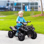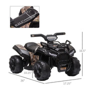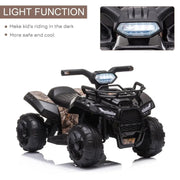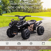 The Music-Powered Black ATV for Kids Ages 18-36 Months is the perfect ride-on toy for adventurous little ones. This electric ATV features a sleek black design with camo details, making it visually appealing and exciting for children. With its innovative shape and color scheme, this ride-on toy will immediately capture the attention of young adventurers.Equipped with music and a button on the handlebar for moving forward, this kids' ATV provides a simulated driving experience that will make your child feel like they're driving the real thing. The simple controls, including the handlebar and rechargeable battery, make it easy for children to operate this ride-on ATV.Safety is a top priority with this ATV. It features four wear-resistant wheels that create a smooth ride, allowing it to be used on a variety of surfaces, including sidewalks and gravel driveways. The durable plastic material and steel frame ensure the longevity of this ride-on toy, so your child can enjoy countless hours of fun.This rechargeable ride-on ATV has a battery that can be fully charged, providing up to 45 minutes of continuous driving. The dimensions of this kids' four wheeler are 27.5" L x 16.5" W x 17.75" H, with a weight capacity of 55lbs. It is suitable for children ages 18-36 months.Key Features:- Music and button for simulated driving experience- Four wear-resistant wheels for a smooth ride on various surfaces- Durable plastic material and steel frame for longevity- Easy-to-operate handlebar and rechargeable battery- Battery provides up to 45 minutes of continuous drivingProduct Specifications:- Brand: Unbranded- Recommended Age Range: 18 - 36 Months- Color: Black with camo details- Battery and charger included- ASTM certified- Dimensions: 27.5" L x 16.5" W x 17.75" H- Weight Capacity: 55lbsEncourage your little ones to embrace their adventurous spirit and explore the world around them with the Music-Powered Black ATV for Kids Ages 18-36 Months. This ride-on toy will inspire their imagination and make outdoor playtime even more exciting. Get ready for endless hours of fun and adventure with this electric ATV!