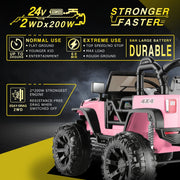The Premium 24V 2 Seater Kids Ride On Truck with Remote Control and Powerful Dual Motors Get ready for an adventurous ride with the Premium 24V 2 Seater Kids Ride On Truck with Remote Control and Powerful Dual Motors. This ride-on truck is the perfect gift for boys and girls who have a spirit of adventure. With its realistic appearance and high-performance 24V 2x200W motor, this ride-on truck will provide endless fun and excitement. Key Features: Realistic design with high-performance 24V 2x200W motor Parental remote control for added safety Wear-proof EVA tires for a smooth ride Reinforced seat belt for enhanced safety Soft start and soft brake technology for a comfortable driving experience Electron-assisted steering wheel for easy maneuverability Auto-reset overheat protector for added safety Upgraded spring suspension system for a smoother ride Music, Bluetooth, childhood story, and LED lights for added fun Specifications: Color: Red / Pink / Black / Green Recommended Age: 3-8 years Material: PP and ABS plastic, Metal Battery Type: 24V 9AH Motor Type: 200W*2 Suspension: Full-Metal Suspension Seat Size: 18 inch Wheels Size: 14 inch Maximum User Weight: 130lbs Safe Speed: 1.8-4.9 mph Charging Time: 8-12 hours Run Time: 100-120 minutes Music Function: AUX & USB port / Bluetooth / MP3 / Built-in music Overall Size: 48.5 inch x 34.7 inch x 31.5 inch Experience the thrill of driving with the Premium 24V 2 Seater Kids Ride On Truck with Remote Control and Powerful Dual Motors. This ride-on truck is designed to provide maximum power, space, comfort, and safety. With its 2 spacious large size seats, your kids can share the driving fun together. The soft start and electronic power steering ensure a smooth and comfortable driving experience. The soft brake and guarantee of certificate provide added safety for your peace of mind. Featuring a safety guarantee certified by ASTM & CPSIA, this ride-on truck is equipped with a range of safety features including electron-assisted steering, auto-reset overheat protector, reinforced seat belts, lockable doors, LED searchlight, metal suspension, high chassis design, and EVA explosion-proof wheels. Made of high-quality non-toxic PP material, this ride-on truck is designed to prevent your child from any danger. The Premium 24V 2 Seater Kids Ride On Truck with Remote Control and Powerful Dual Motors is not just about safety, it's also about fun. With its multiple functions like music, Bluetooth connectivity, USB port, and LED lights, your child will have a blast driving this ride-on truck. The high-bright LED headlights, tail lights, and searchlights make the driving experience super cool, especially at night. With its 24V 9AH battery and 2x200W motors, this ride-on truck provides more power and longer driving time compared to the 12V version. The large battery can last up to 120 minutes of uninterrupted driving with a full load. The two driving modes, parental remote control, and kids manual operate, give you the flexibility to choose the driving mode that suits your child's skill level. The Premium 24V 2 Seater Kids Ride On Truck with Remote Control and Powerful Dual Motors is built to handle rough terrains with its full-metal suspension and 14-inch EVA wheels. The suspension system provides better shock absorption, ensuring a smooth ride even on bumpy roads. Your child will have a great driving experience no matter the terrain. Get your child the ultimate gift of adventure with the Premium 24V 2 Seater Kids Ride On Truck with Remote Control and Powerful Dual Motors. Whether it's their birthday or a holiday, this cool kids truck will bring a smile to their face. Please note that due to logistics restrictions, this product is delivered in two packages. Contact us for an installation video to ensure proper assembly and to prevent any damage during assembly.
