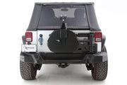 The heavy duty rear bumper includes 2 in. receiver tow hitch made of 1/4 in. steel reinforced with 7/16 in. ring. The steel welded accessory panel allows for mounting a hi-lift jack or gas can. You can mount the tire in standard or slanted position, alleviating weight from the tailgate. A 3rd brake light bracket is included but the light kit is sold separately. Modular tire carrier, part number 9950919, is sold separately.