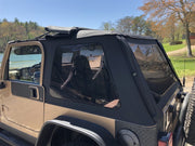 The Rampage Frameless Trail Top installs over the original equipment factory roll bar for a snug fit. This unique design allows for larger side windows and improved visibility with removable side and rear windows that quickly convert the soft top into an open Safari top. Windows use heavy duty molded tooth zippers and are easily replaced or removed. The windows are also stored in a special separation panel between the ceiling and roof top which is concealed to protect the windows from scratches or puncture. The fastback style offers improved aerodynamics and a quieter ride than factory bow style tops. The windshield channel, door surrounds and tail gate bar are required. These can be purchased separately.