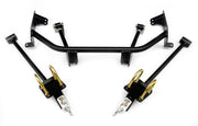 Bolt-On 4-Link for 1960-1964 Galaxie. Includes R-Joints, adjustable upper bars, fixed lower bars, bolt-on cradle, axle brackets and hardware. Powder coated black. For use with Shockwaves or Coil-Overs, sold separately.