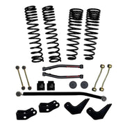 Raise Your Gladiator JT Mojave to reach new heights and go get some off-road freedom in a bigger, bolder way. Claim your Desert Rated badge of honor with more ground clearance to conquer more terrain with 35s. You can keep your Jeep engineered special internal-bypass shocks and hydraulic jounce bumpers, yet still upgrade the OEM coils to an optimum performance option. Skyjacker's specifically engineered 2-stage dual rate long travel coil springs progress from a 1st Flex Rate to a 2nd Ride Rate. The 1st Flex Rate stage delivers a comfortable ride that expands during full articulation and keeps the tires in contact with the terrain. The 2nd Ride Rate stage only engages after compression past the flex rate. Engineered specifically for the Gladiator, the rear coils are designed with a higher, stronger 2nd Ride Rate. Whether you pull it or pack it, the 2nd rate allows ride control and stability for added weight activities like overlanding and towing. The longer replacement Front Lower and the Rear Upper Control Link Arms both include Skyjacker installed pressed-in HD OEM style rubber bushings. The front lower arms are formed inward to improve tire clearance. The replacement Front Adjustable Track Bar includes Skyjacker installed pressed-in HD OEM style rubber bushing at the frame mount. The adjustable axle mount end is a 3/4- in. Heavy-Duty Rod End, Jam Nut and Alignment Bushings. Front and Rear Shock Extension Relocation Brackets reposition your factory remote-reservoir shocks. Front 2 in. Bump Stop Spacers bolt onto the axle bump pad and retains the OEM function of the hydraulic jounce bumpers. Extended Length Sway Bar End Links allow full articulation as the suspension drops (full droop). The front end links include Skyjacker installed pressed-in HD OEM style rubber bushings. The rear end links come with press-in Poly bushings. Both sets are Zinc plated for corrosion protection. Rear 2 in. Bump Stop Spacers bolt onto the axle bump pad.