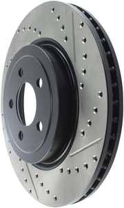 StopTech Drilled and Slotted Sport Rotors are 1-piece direct replacement brake discs for factory brake systems and stock calipers that look great behind your wheels – and offer significantly improved braking performance. The unique cross-drilling and slotting aids with heat and brake dust dispersal; prevents glazing of the pads; adds bite and improves wet and dry braking performance. Built to last; the black e-coating provides protection from corrosion and the high carbon metallurgy (in most applications) offers quieter operation; better crack resistance and increased performance.