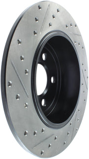 StopTech Drilled and Slotted Sport Rotors are 1-piece direct replacement brake discs for factory brake systems and stock calipers that look great behind your wheels – and offer significantly improved braking performance. The unique cross-drilling and slotting aids with heat and brake dust dispersal; prevents glazing of the pads; adds bite and improves wet and dry braking performance. Built to last; the black e-coating provides protection from corrosion and the high carbon metallurgy (in most applications) offers quieter operation; better crack resistance and increased performance.