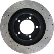 StopTech Drilled and Slotted Sport Rotors are 1-piece direct replacement brake discs for factory brake systems and stock calipers that look great behind your wheels – and offer significantly improved braking performance. The unique cross-drilling and slotting aids with heat and brake dust dispersal; prevents glazing of the pads; adds bite and improves wet and dry braking performance. Built to last; the black e-coating provides protection from corrosion and the high carbon metallurgy (in most applications) offers quieter operation; better crack resistance and increased performance.