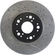 StopTech Drilled and Slotted Sport Rotors are 1-piece direct replacement brake discs for factory brake systems and stock calipers that look great behind your wheels – and offer significantly improved braking performance. The unique cross-drilling and slotting aids with heat and brake dust dispersal; prevents glazing of the pads; adds bite and improves wet and dry braking performance. Built to last; the black e-coating provides protection from corrosion and the high carbon metallurgy (in most applications) offers quieter operation; better crack resistance and increased performance.