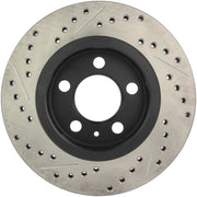 StopTech Drilled and Slotted Sport Rotors are 1-piece direct replacement brake discs for factory brake systems and stock calipers that look great behind your wheels – and offer significantly improved braking performance. The unique cross-drilling and slotting aids with heat and brake dust dispersal; prevents glazing of the pads; adds bite and improves wet and dry braking performance. Built to last; the black e-coating provides protection from corrosion and the high carbon metallurgy (in most applications) offers quieter operation; better crack resistance and increased performance.