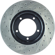 StopTech Drilled and Slotted Sport Rotors are 1-piece direct replacement brake discs for factory brake systems and stock calipers that look great behind your wheels – and offer significantly improved braking performance. The unique cross-drilling and slotting aids with heat and brake dust dispersal; prevents glazing of the pads; adds bite and improves wet and dry braking performance. Built to last; the black e-coating provides protection from corrosion and the high carbon metallurgy (in most applications) offers quieter operation; better crack resistance and increased performance.