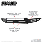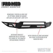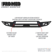 Westins Pro-Mod Front Bumper combines enhanced vehicle protection, with great looks. Pro-Mods revolutionary lightweight modular design is uniquely engineered with outrigger reinforcement brackets to provide maximum front end protection without compromising on strength, integrity or durability. The "high and tight" bumper profile creates a greater approach angle, which significantly improves off-road driving capabilities. The lightweight design also requires smaller shipping packages which dramatically reduces shipping costs. Pro-Mod bumpers feature a textured black finish with an e-coated base coat, providing long lasting corrosion protection from the elements. Once you see the Pro-Mod Front Bumper, the choice becomes obvious.