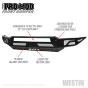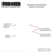 Westins Pro-Mod Front Bumper combines enhanced vehicle protection, with great looks. Pro-Mods revolutionary lightweight modular design is uniquely engineered with outrigger reinforcement brackets to provide maximum front end protection without compromising on strength, integrity or durability. The "high and tight" bumper profile creates a greater approach angle, which significantly improves off-road driving capabilities. The lightweight design also requires smaller shipping packages which dramatically reduces shipping costs. Pro-Mod bumpers feature a textured black finish with an e-coated base coat, providing long lasting corrosion protection from the elements. Once you see the Pro-Mod Front Bumper, the choice becomes obvious.
