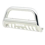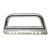 Westin(TM) E-Series Bull Bars are a front-end light bar designed for trucks and larger model SUVs. It is made of 3 diameter polished stainless steel tube. It mounts utilizing existing vehicle mounting points and installation does not require any drilling to the vehicle frame. Comes complete with mounting kit the Westin(TM) E-Series Bull Bar provides a mounting point for 2 auxiliary lights up to 6 in diameter. It features a die-cut Westin(TM) block logo design on the stainless steel skid plate unique to the Westin(TM) E-Series Bull Bar.