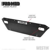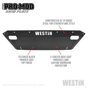 Westin's Pro-Mod Skid Plate is constructed of durable 10 gauge steel to protect your vehicle from damage caused by road debris. It mounts directly to the frame and includes a laser-cut Westin logo. Offers bolt-on installation so no drilling is required. Hardware and mounting brackets included.