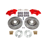 Installation note: Due to the increased size of the caliper a wheel spacer (included) is needed for installation. To verify that you have enough stud engagement on the lug nut we include extended wheel studs. You WILL have to remove the front wheel bearings to extract and install the new extended studs. Slight trimming of the stock dust shield will be needed.